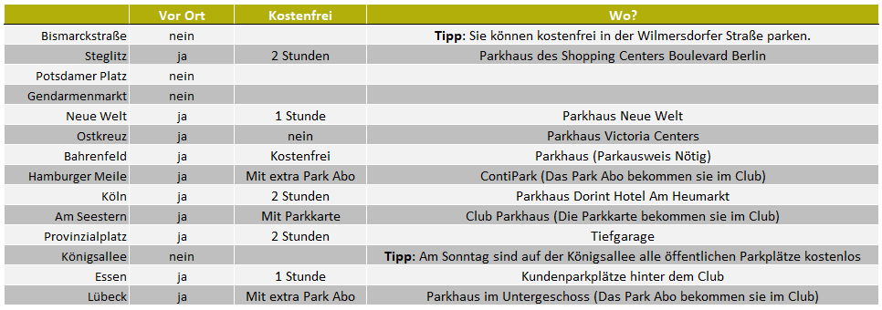 Bitte beachten Sie, dass bei kostenfreien Parkplätzen die Parkkarten im Club abgestempelt werden müssen.